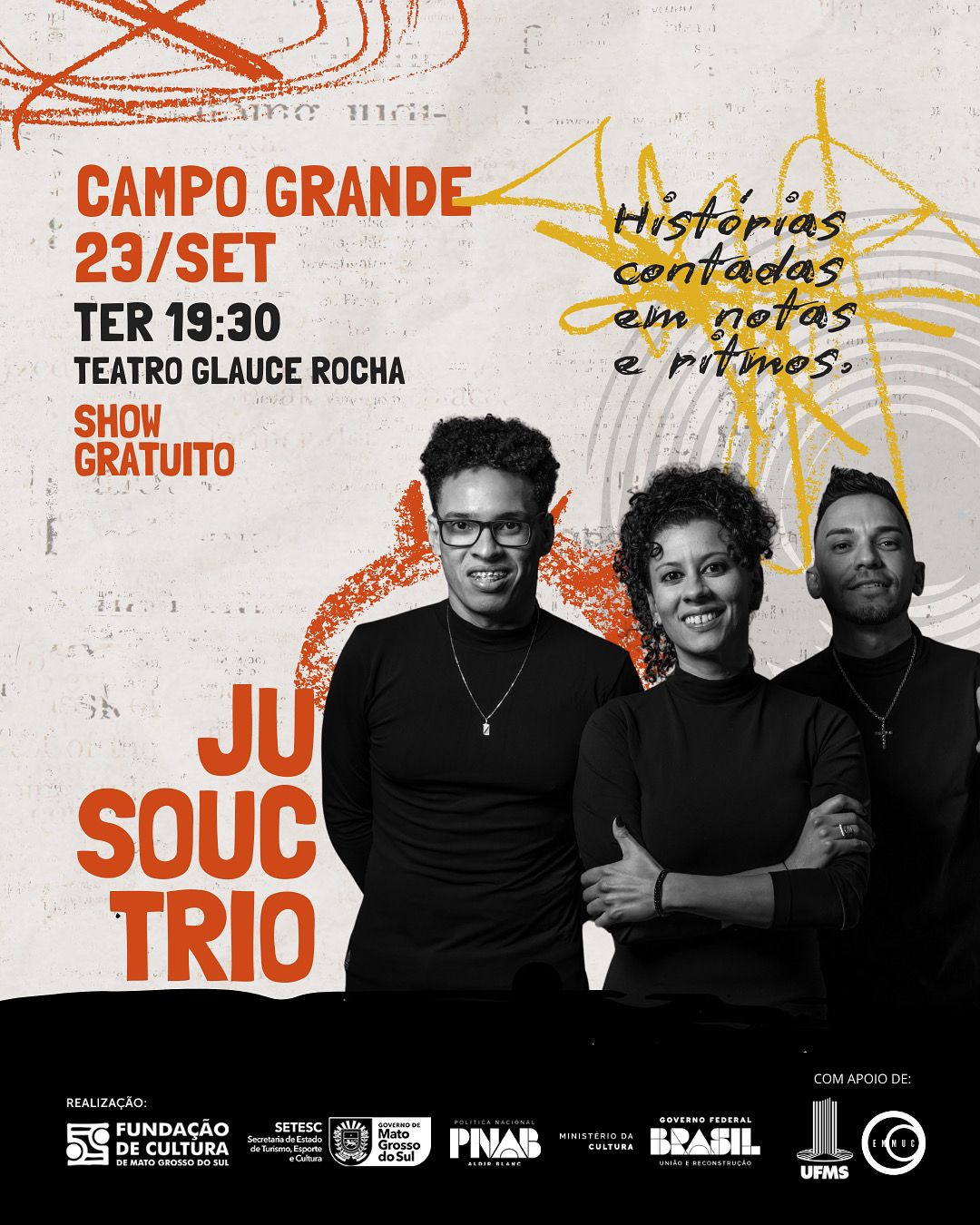 Na próxima semana, 23 de setembro (terça-feira), às 19h30, no Teatro Glauce Rocha, na Capital, será realizado o show de estreia do projeto Ju Souc Trio, que vai circular por quatro cidades (Campo Grande, Ponta Porã, Naviraí e Aquidauana) de Mato Grosso do Sul. A proposta do trabalho é levar música autoral, brasilidades e um forte viés de consciência social. Os shows são gratuitos, com classificação livre. Informações sobre o projeto pelo Instagram (@jusouc.music).